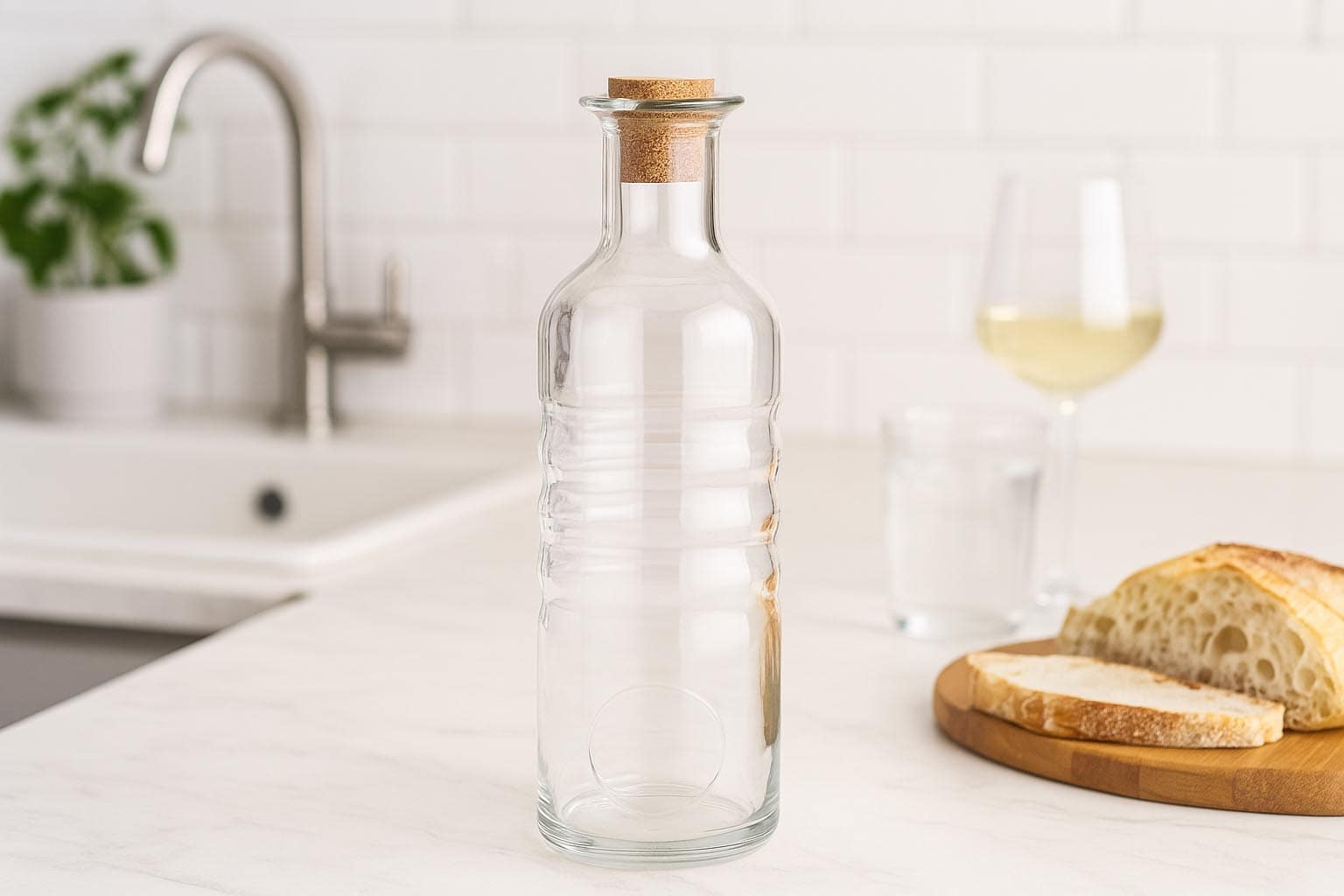 Cu o capacitate de 750 ml și o formă rotundă, sticla impresionează prin aspectul său elegant și manevrabilitatea practică. Gâtul cu dop de plută asigură o etanșare sigură și stilată, protejând optim conținutul.